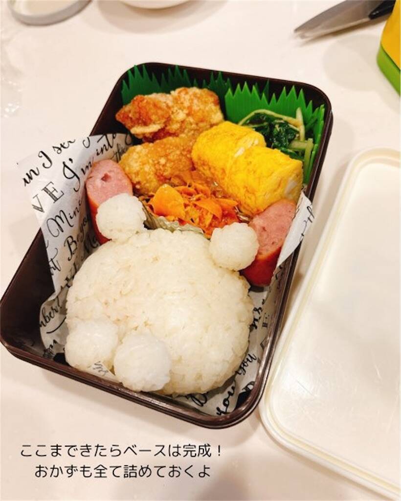 こんな感じで顔になる大きな白いおにぎりからお弁当につめていくよ