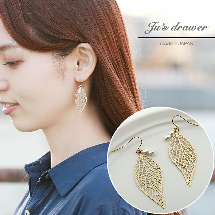 送料無料 ピアス イヤリング フック ピアス リーフ 葉っぱ 透かし ビーズ アレルギー対応 レディース シンプル ゴールド 可愛い 華奢 揺れる 奥平順子