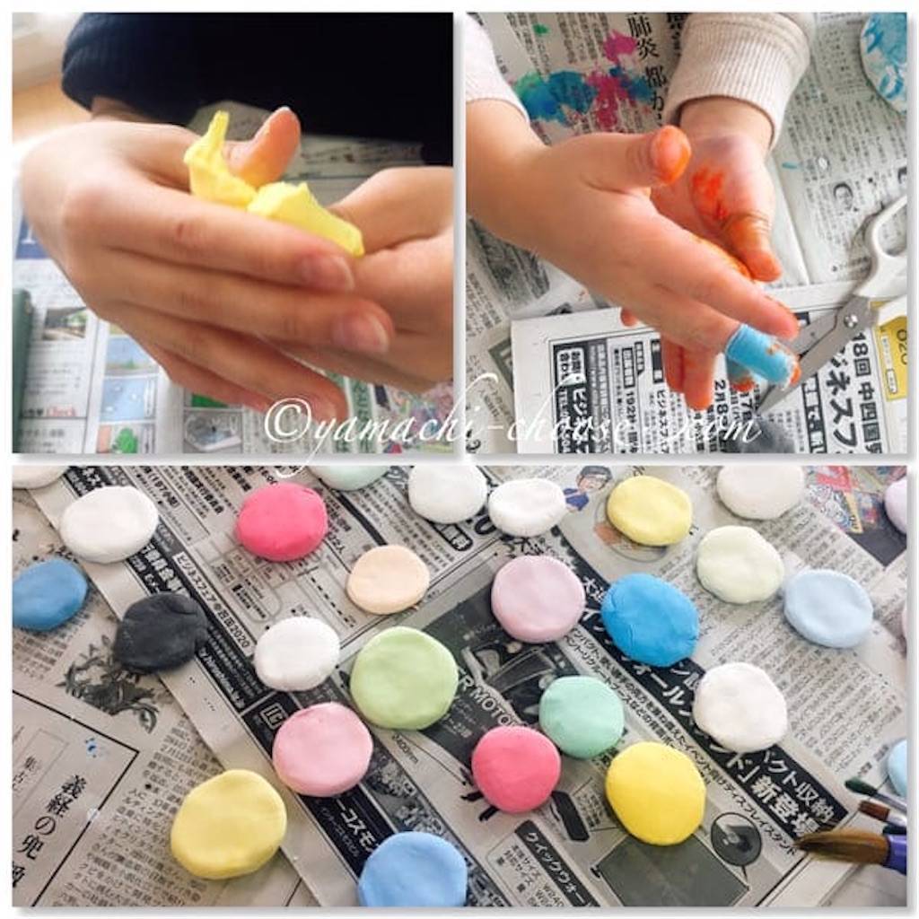 子供たちが色を混ぜたいって言いだしたから紙粘土に絵の具を混ぜていろんなカラーの土台が完成
