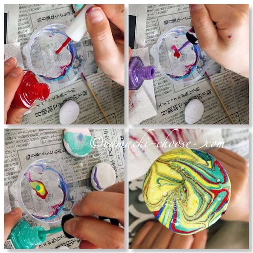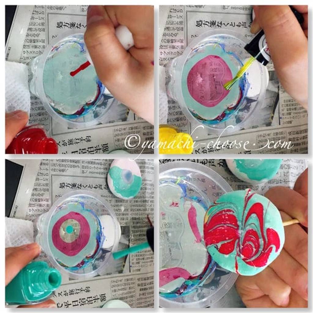 水面にマニキュアなどを浮かべて、細い棒を使って表面を動かしマーブル模様を作っていく技法!